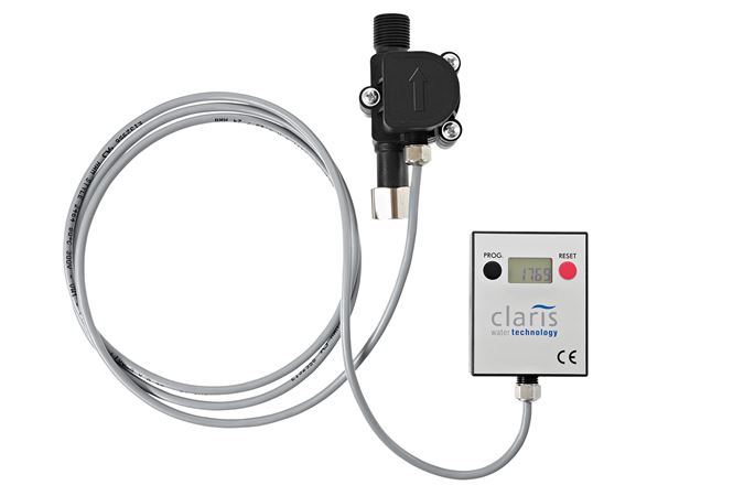 Der CLARIS Flow Sensor wurde speziell für die Kontrolle von Wasserfiltersystemen entwickelt. Nach Eingabe der Ausgangskapazität des jeweiligen Filters misst der CLARIS-Flow Sensor die bezogene Filtratmenge und zeigt die noch zur Verfügung stehende Restkapazität an.