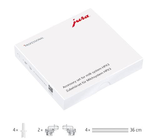 Das Set HPX3 kann für alle JURA-Professional-Vollautomaten der X-Linie und GIGA X-Linie, die das Milchsystem HP3 und Milchausläufe des Systems CX2 nutzen, verwendet werden. Es besteht aus Milchschläuchen, Anschlussteilen und Ansaugstutzen.