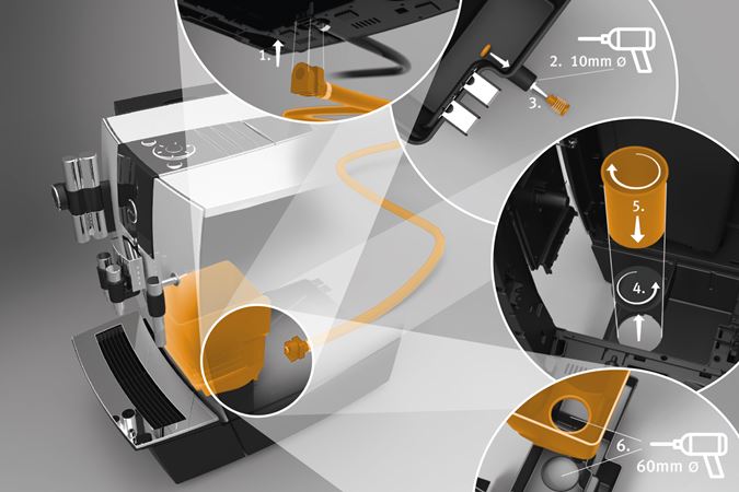 Wo unterbrechungsfreier Kaffeegenuss gefragt ist, empfiehlt sich die Verwendung des praktischen Kaffeesatzabwurf- / Restwasserablauf-Set XJ. Es erübrigt das Leeren der Restwasserschale sowie des Kaffeesatzbehälters während des täglichen Gebrauchs. Dank einer speziellen Konstruktion des Kaffeesatzbehälters und der Restwasserschale wird der Kaffeesatz, respektive das Restwasser durch die Bodenplatte geleitet und in einem entsprechenden Behälter gesammelt. Die dazu notwendige Bohrungen der Tisch-, bzw. Küchenplatte sind im Serviceumfang nicht enthalten. Anleitungen zu den Bohrungen für das Kaffeesatzabwurf-/ Restwasserablauf-Set entnehmen Sie der technischen Dokumentation Ihres Vollautomaten. Der anschliessende, technische Umbau ist vom autorisierten JURA-Partner schnell vorgenommen.